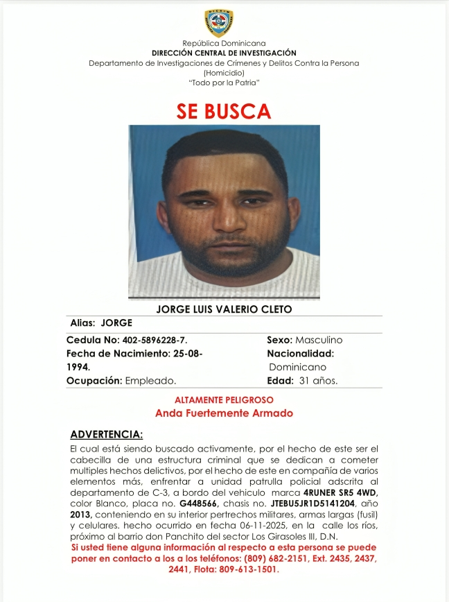 El operativo desplegado tras el lamentable incidente del 6 de noviembre continúa activo en todo el Gran Santo Domingo, con el propósito de localizar a “Picante” y desarticular la red delictiva con la que estaría vinculado. Los otros dos involucrados identificados son Jorge Luis Valerio Cleto y Christopher Michael Espaillat, conocido como “Plomo”, quienes también son señalados por su participación directa en el suceso.