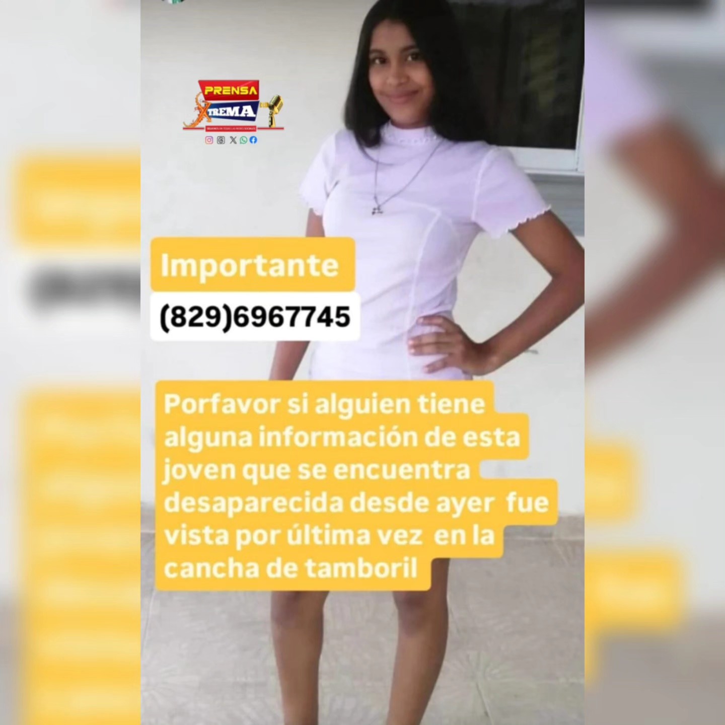 De acuerdo con la información proporcionada por los familiares, la joven salió de su residencia en horas de la tarde con destino a la cancha principal del municipio, ubicada en el centro urbano de Tamboril. Desde ese momento, no se ha tenido contacto con ella ni se conoce su ubicación actual, a pesar de los intentos de comunicación realizados por sus parientes durante toda la noche.